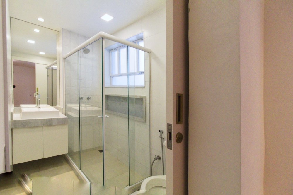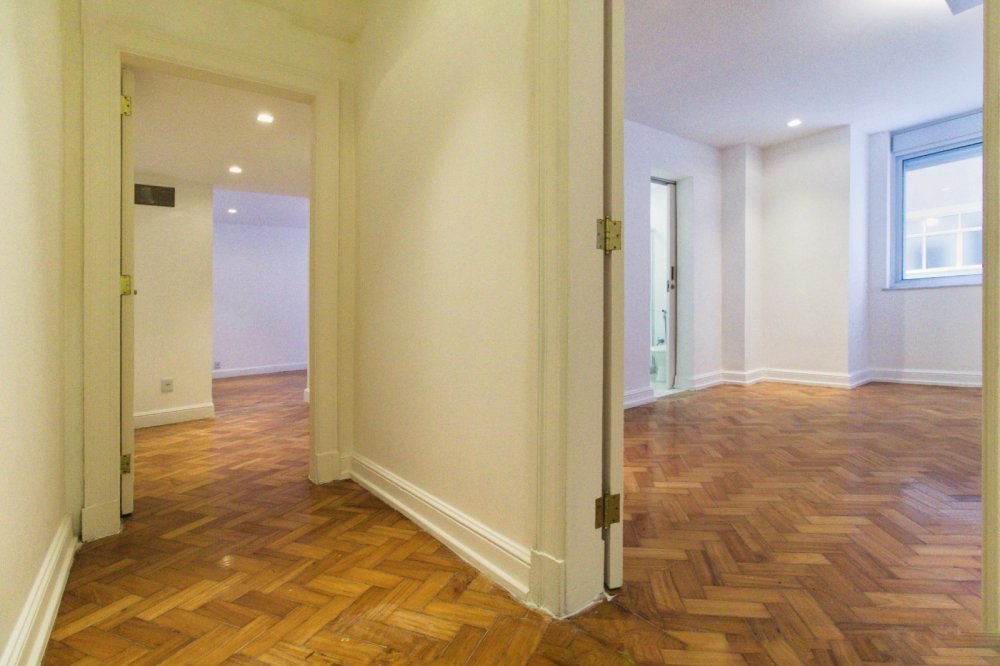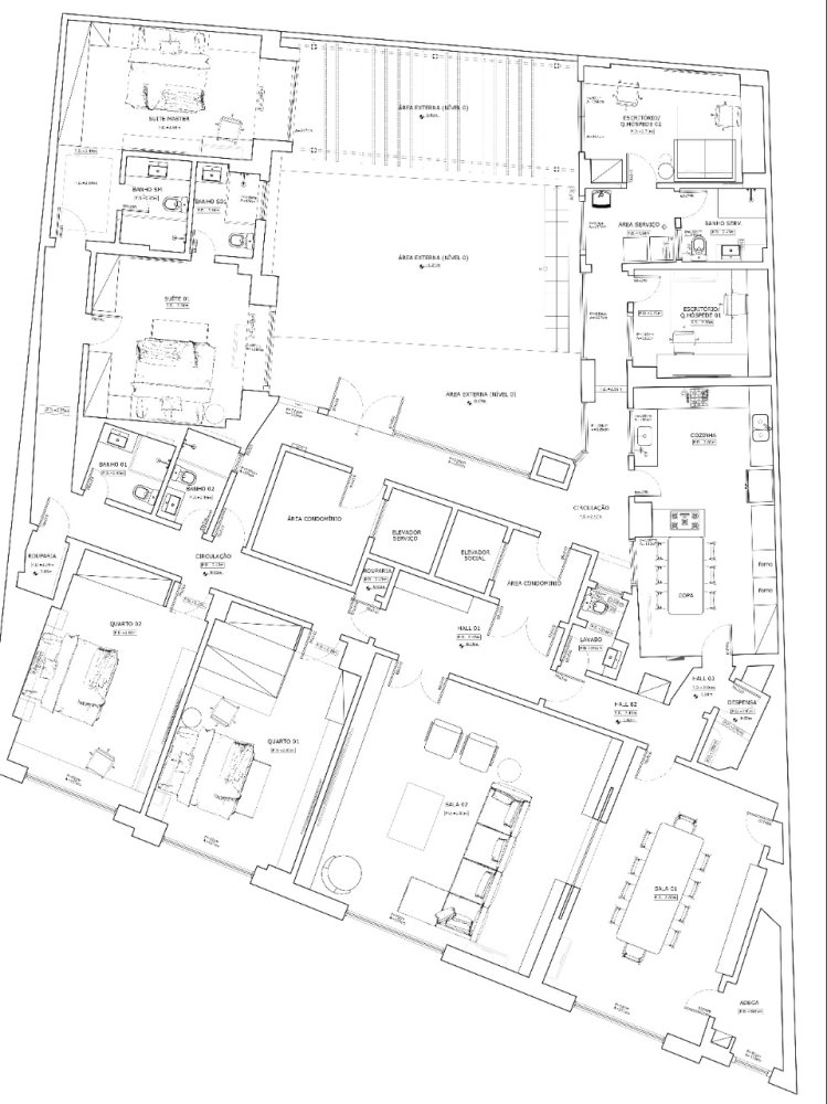 Piso parquet espinha-de-peixe nas áreas comuns; Hall de entrada com separação por belas portas duplas; Duas salas, sendo a de estar com mais de 40m² e sala de jantar com quase 30m², separadas por portas de madeira maciça; Hall de circulação social e hall de circulação de serviço; Lavabo; Ampla copa-cozinha entregue com armários Romanzza e mesa de jantar com tampo de vidro laqueado e madeira, torre quente com forno e microondas embutidos, estações de trabalho separadas com 02 cooktops, 02 coifas e 02 bancadas molhadas com pias separadas; 02 dependências completas de serviço com banheiro entre ambas, os quartos são espaçosos 13m² e 9m², sendo 1 deles revertido para escritório; Área de serviço separada da cozinha; 4 quartos, sendo 02 suítes e 2 quartos com banheiros sociais próximos (01 banheiro social para cada quarto).
