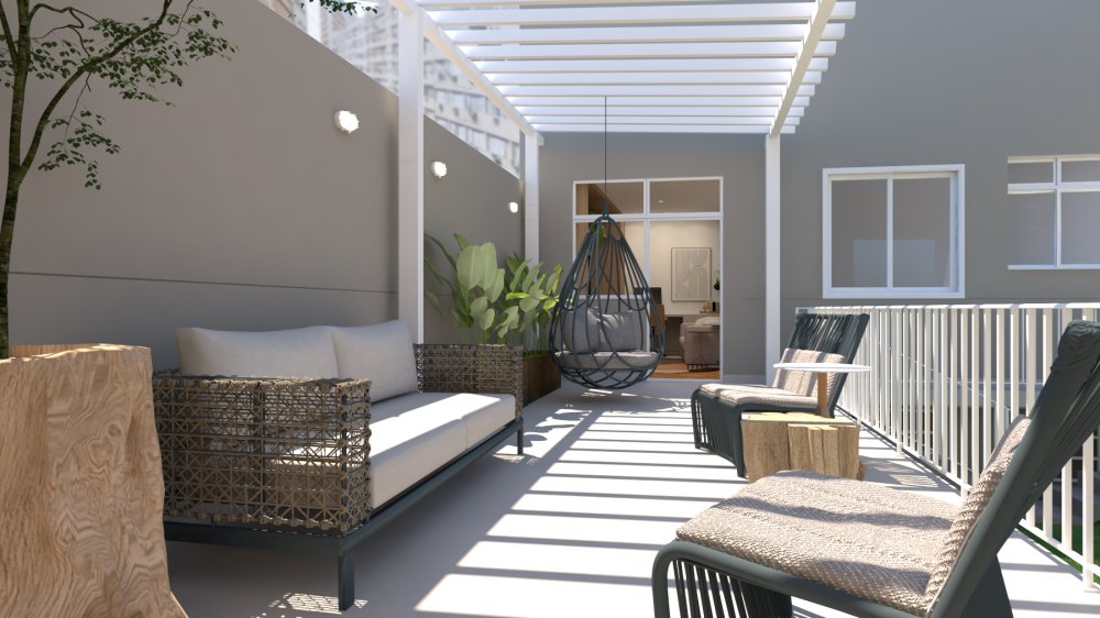 Prisma interno com 83m² em dois níveis. Nível mais alto com a área de ligação entre suíte master e escritório e nível mais baixo com grama sintética.