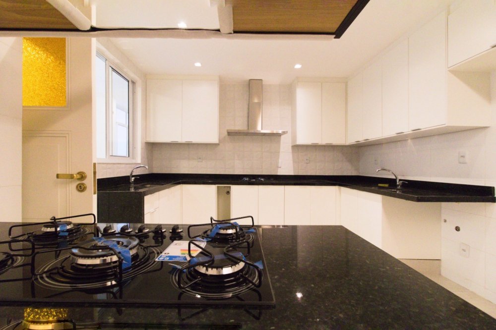 Mobiliado: Cozinha entregue com armários Romanzza e mesa de jantar com tampo de vidro laqueado e madeira, torre quente com forno e microondas embutidos, estações de trabalho separadas com 02 cooktops e 02 coifas. Consulte o Memorial Descritivo.