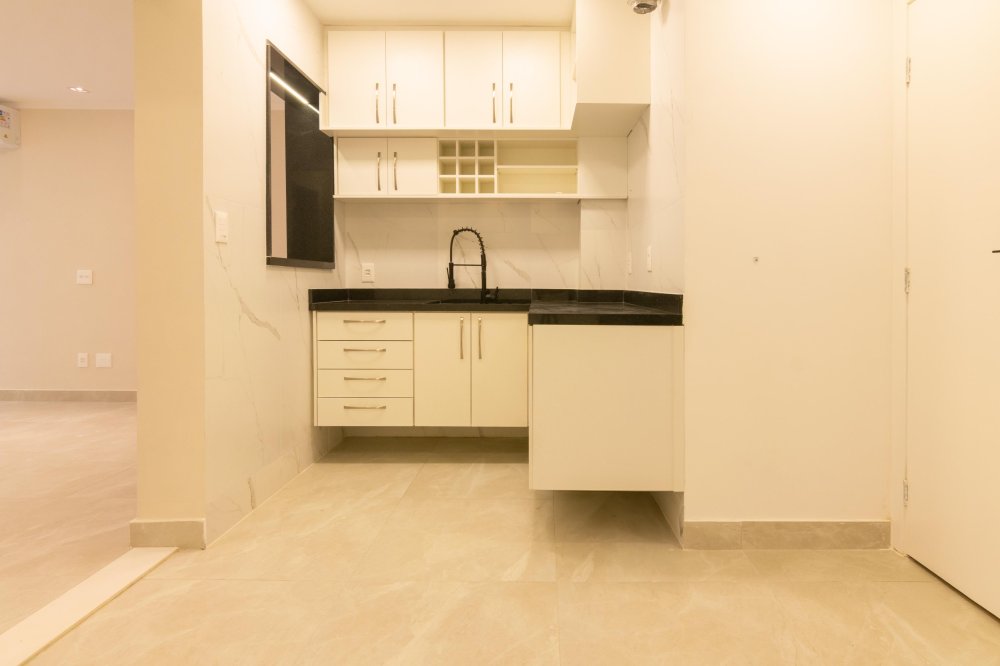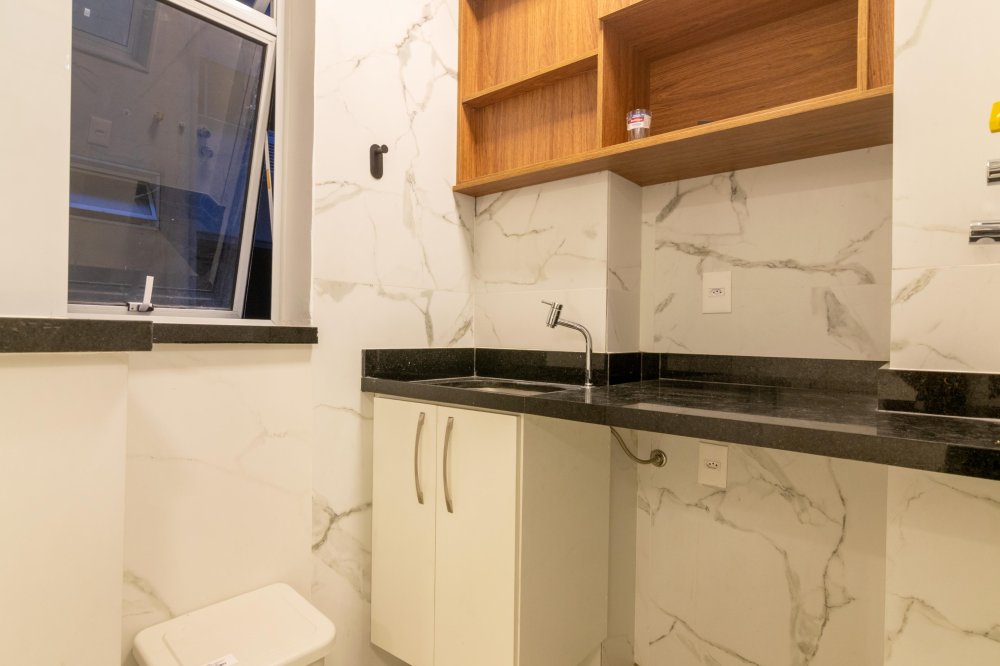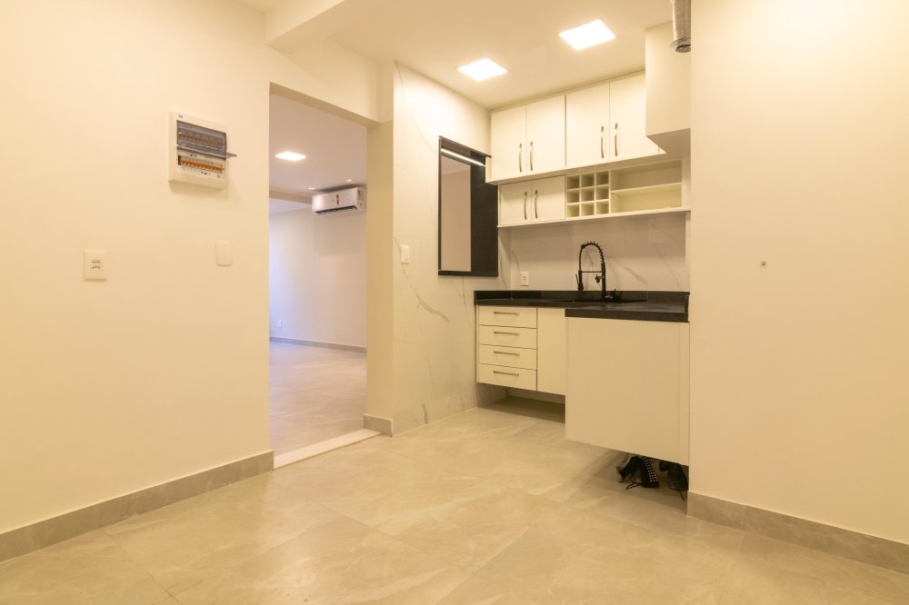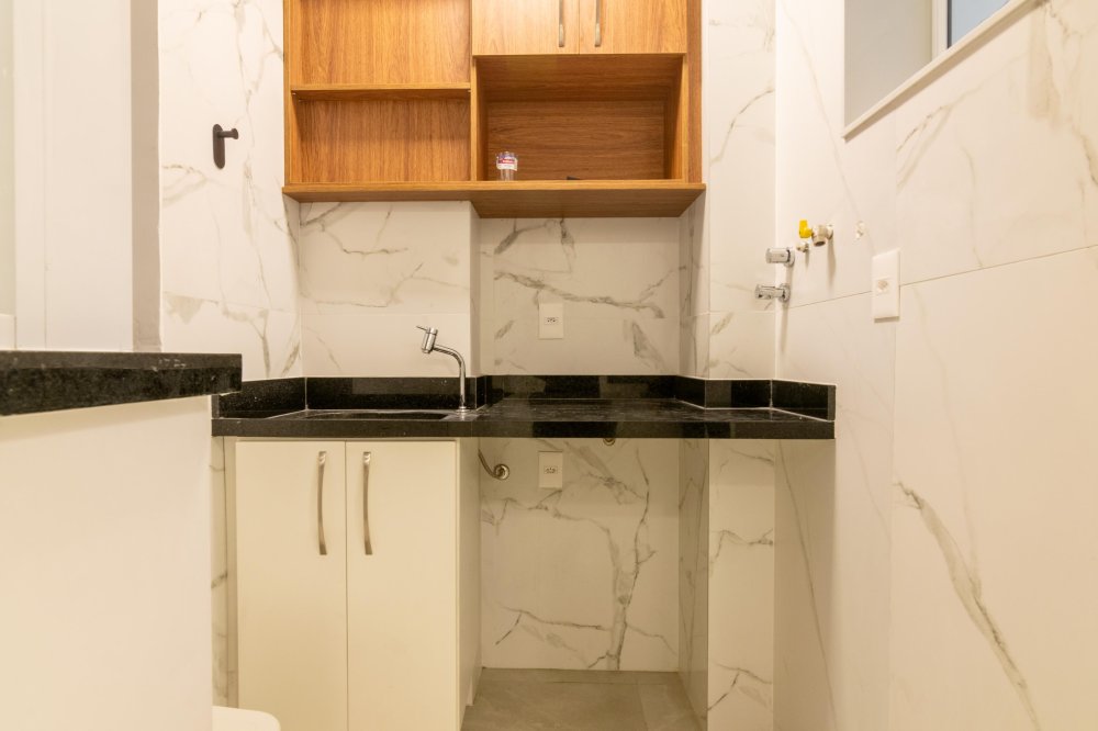 Mobiliado: Sim. Cozinha com bancada e cooktop por indução, área de serviço com tanque e instalação para máquina de lavar, ar-condicionado Split Inverter nos 2 quartos e na sala.