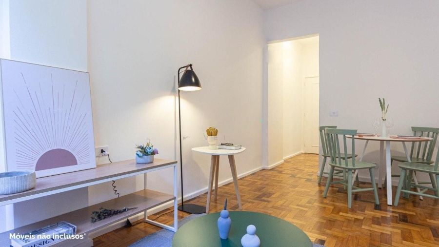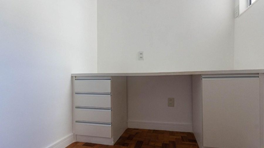 O imóvel conta com sala ampla, dois dormitórios (um deles suíte) e um escritório organizado para o seu home office. A cozinha equipada integra-se à área de serviço com fluidez e funcionalidade.